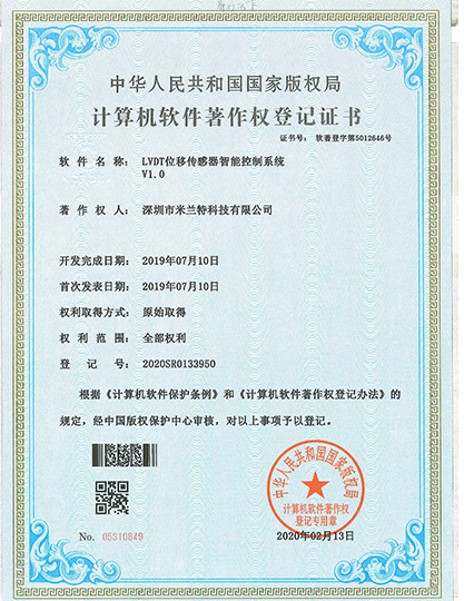 Software copyright registration certificate of Milont magnetostrictive displacement sensor intelligent control system V1.0