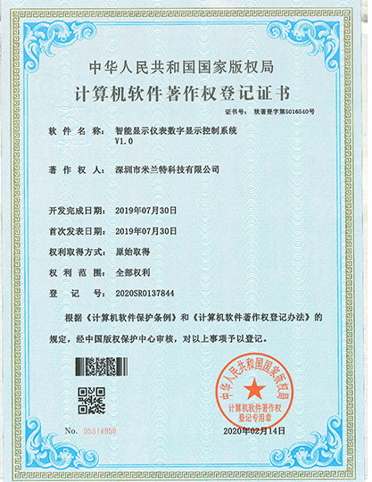 Milont intelligent display instrument digital display control system V1.0 software copyright registration certificate