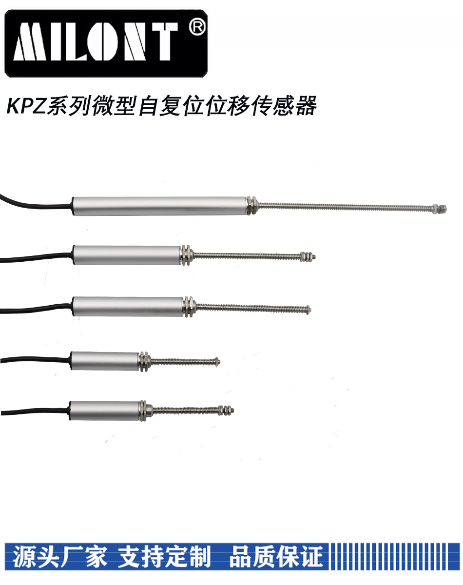 KPZ系列微型自復位式位移傳感器,量程0-100mm可選,輸出0-100%給定輸入電壓(隨位移變化而變化)。傳感器為電位計原理,另外可以外置信號變送模塊,將信號轉換為標準的0-5V,0-10V,4-20m模擬信號或者RS485數字信號。